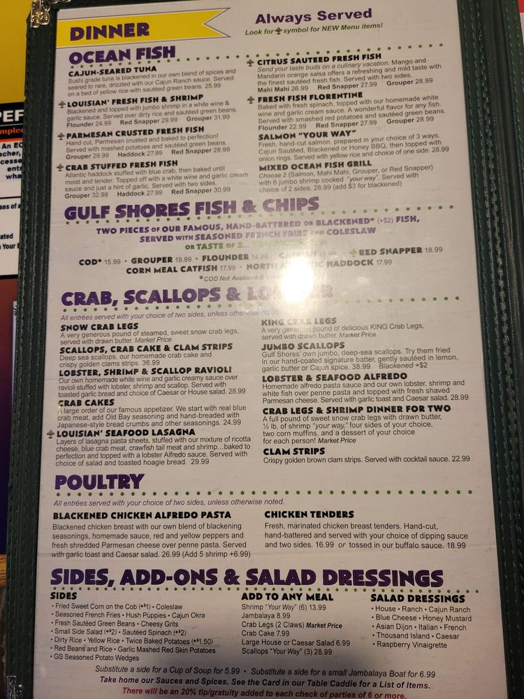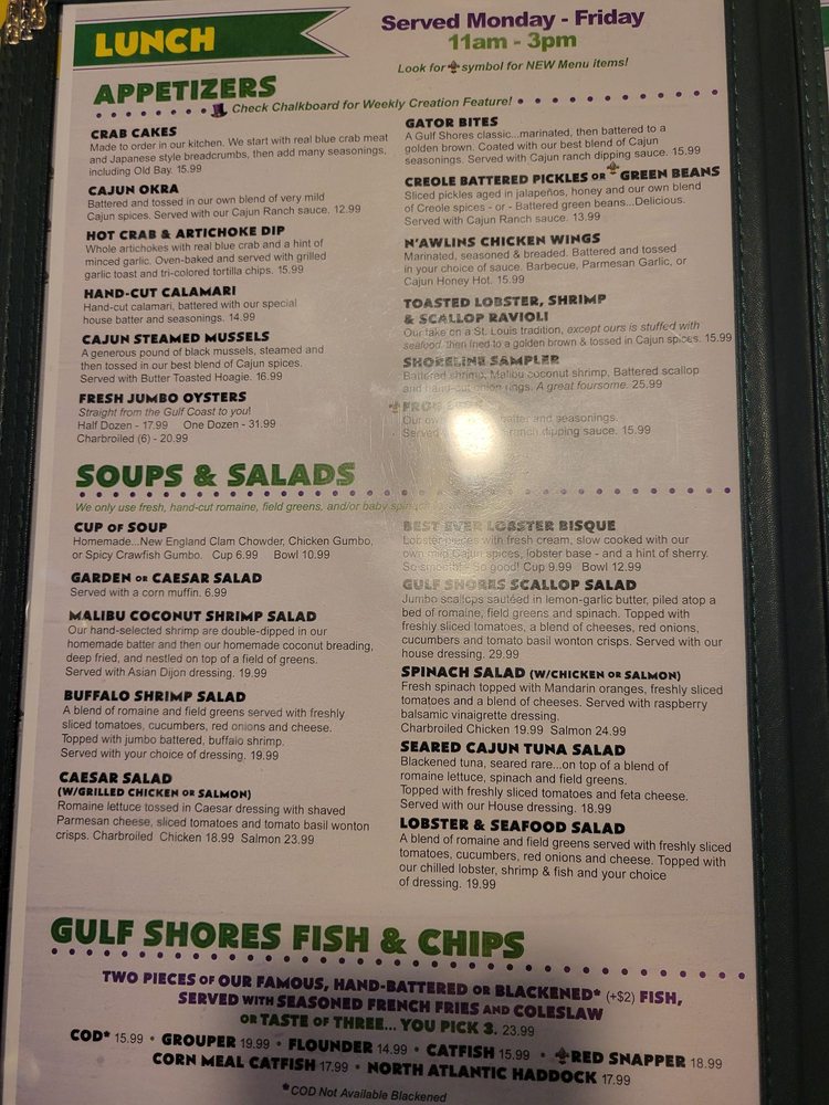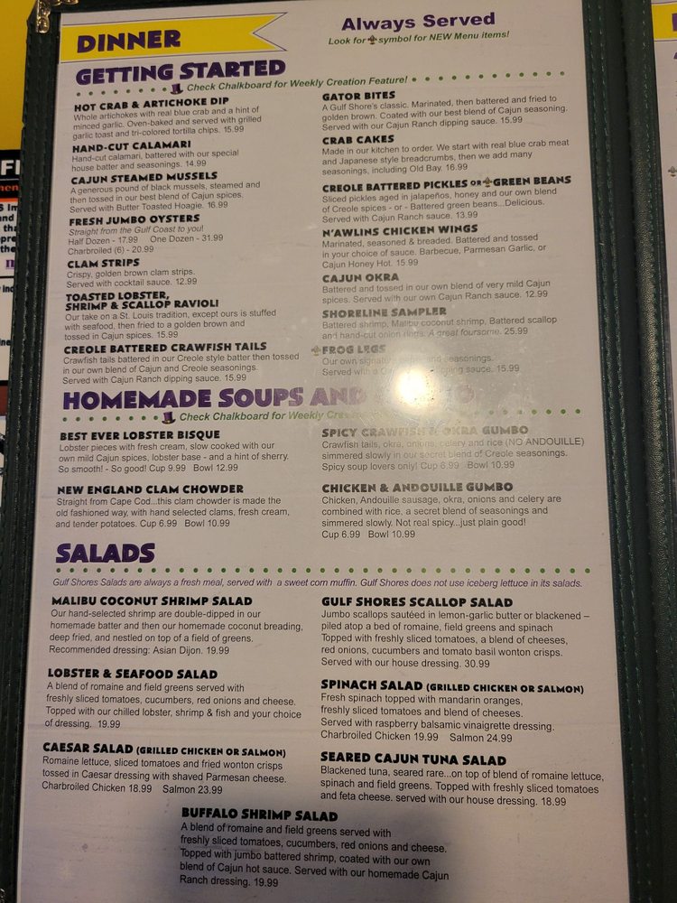 Introducing the menu at Gulf Shores Restaurant & Grill, located in Creve Coeur, MO, offers a variety of delectable options for all types of diners. From the savory Hot Crab & Artichoke Dip to the crispy Handcut Calamari and Handdipped Onion Rings, appetizers set the stage for a delicious meal. The Homemade Soups, like New England Clam Chowder and Nawlins Chicken Gumbo, are comforting and full of flavor. Salads like the Malibu Coconut Shrimp Salad and Gulf Shores Scallop Salad offer a fresh and satisfying option. The diverse menu also includes seafood lasagna, lobster and shrimp salad, fried clams, fish tacos, and more. Customers rave about the amazing food, excellent service, and inviting atmosphere at Gulf Shores. With a full bar, happy hour specials, and accommodating staff, this restaurant is a must-visit for anyone craving Cajun seafood in a welcoming setting.
